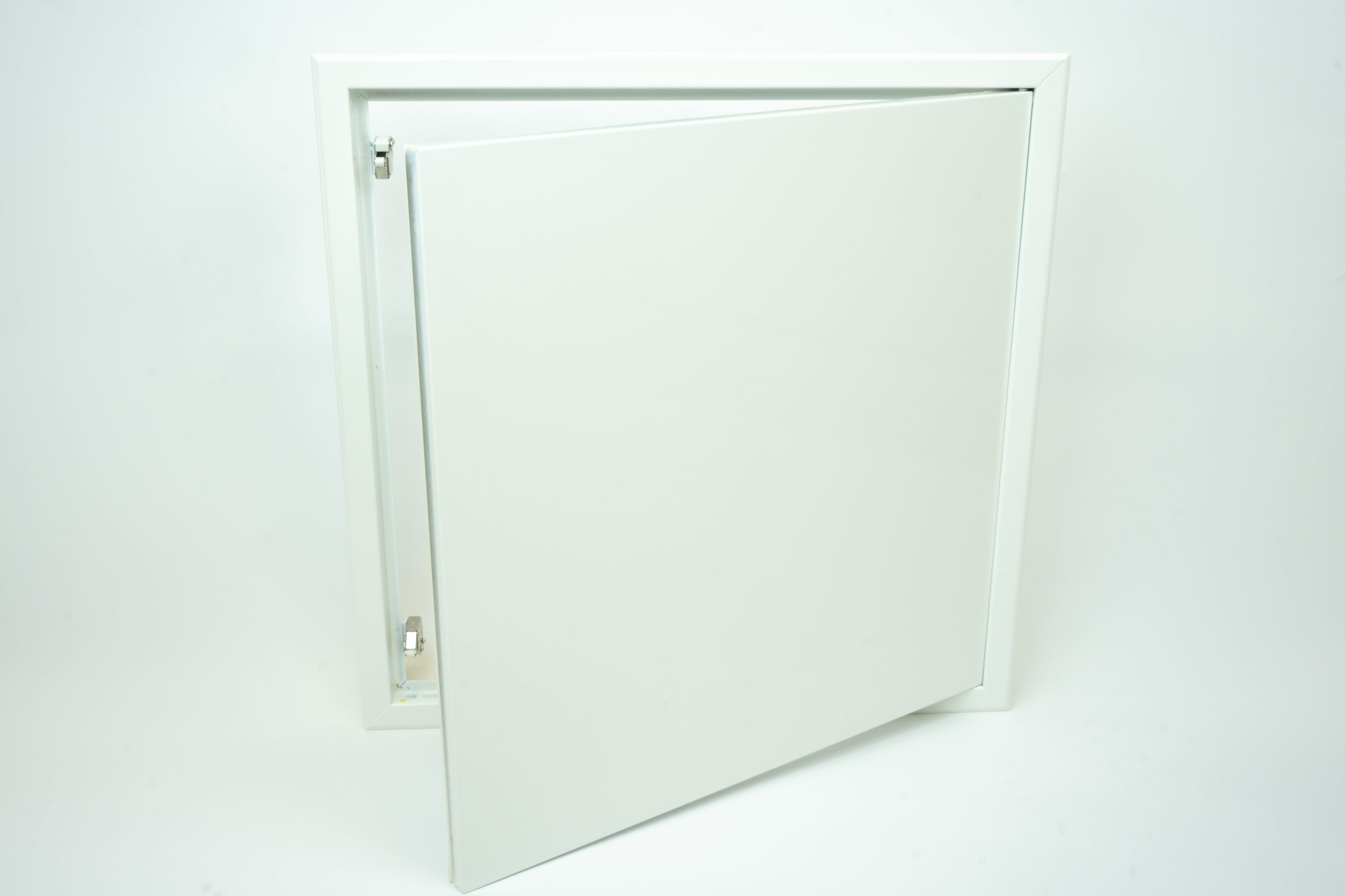 Sinkitty teräsluukku, valkoinen RAL9016. Ilma- ja pölytiivis. Push-up lukitus. Seinä- ja kattoasennuksiin.