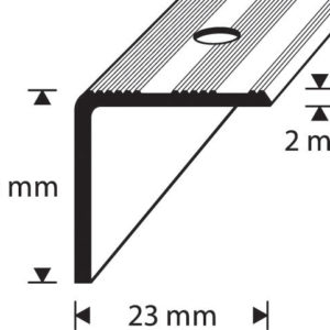 Dione-askelkulmalista, ruuvikiinnitteinen. Uritettu pinta. Leveys 23mm. Korkeus 23mm. Alumiini. Kiillotettu. Pituus 3000mm