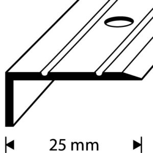 Dione-askelkulmalista, ruuvikiinnitteinen. Uritettu pinta. Leveys 25mm. Korkeus 10mm. Alumiini. Kulta-anodisoitu. Pituus 3000mm
