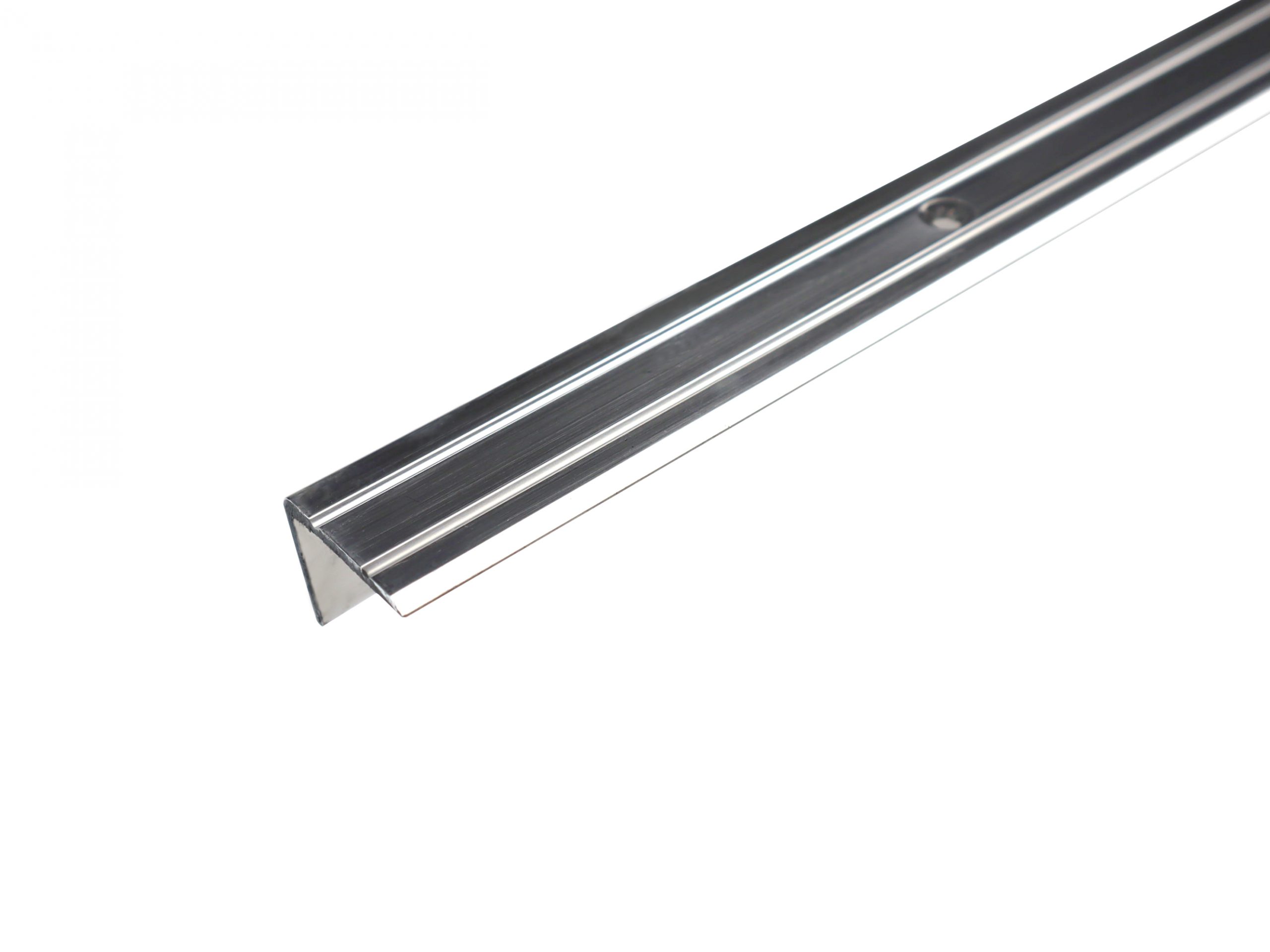 Dione-askelkulmalista, ruuvikiinnitteinen. Uritettu pinta. Leveys 25mm. Korkeus 20mm. Alumiini. Kiillotettu. Pituus 3000mm