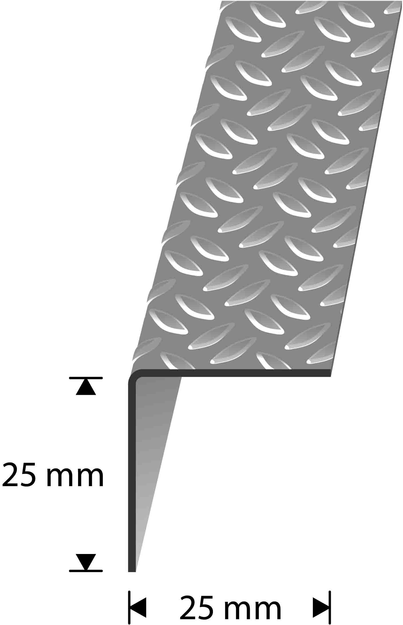 Dione-askelkulmalista, liimakiinnitteinen. Jyväkuvioitu. Leveys 25mm. Korkeus 25mm. Alumiini. Pituus 2000mm