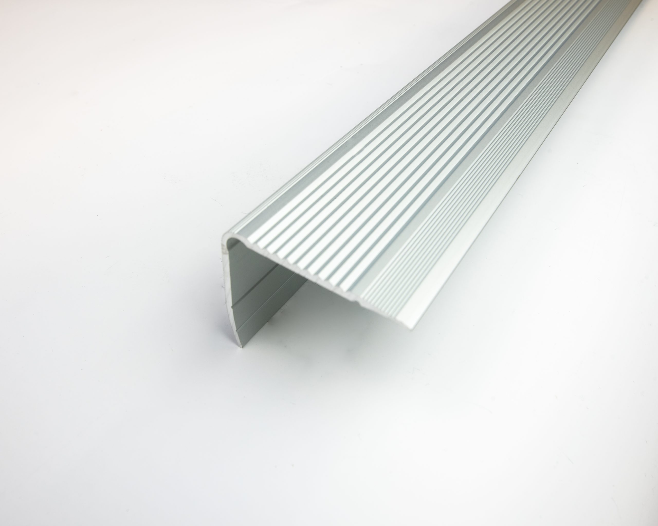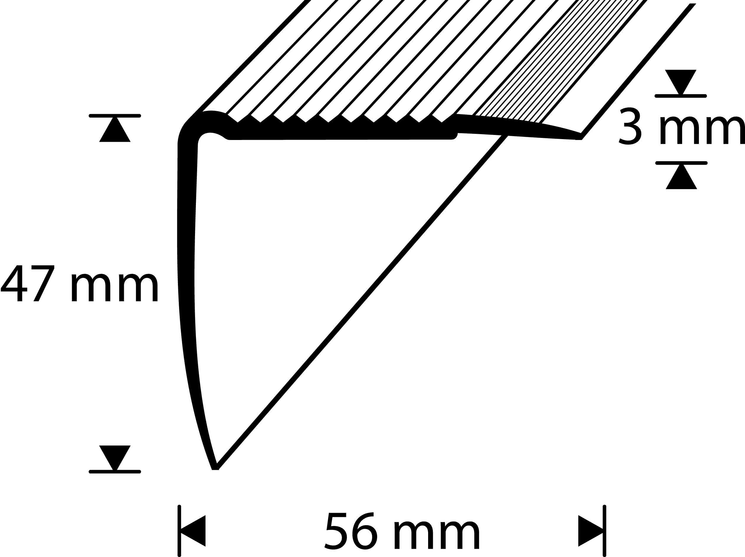 Dione-askelkulmalista, liimakiinnitteinen. Uritettu pinta. Leveys 56mm. Korkeus 47mm. Alumiini. Hopea-anodisoitu. Pituus 3200mm