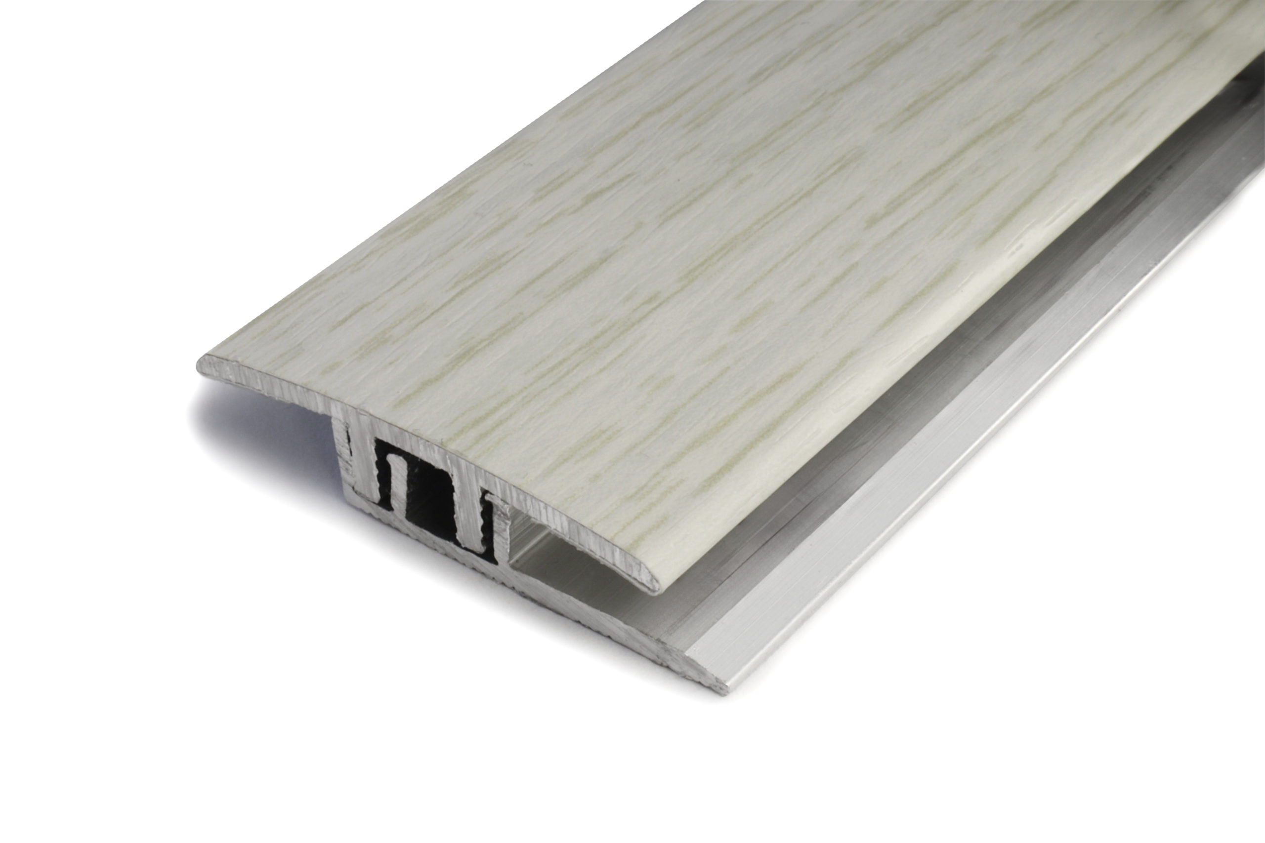 Metal cover strip with under rail. The multi-purpose Dione cover strip is suitable for joining floor materials in the same plane and for finishing expansion joints. Suitable for material thickness of 3.5-6.5 mm. The wood textured metal cover strip is Light oak in colour. The durable metal strip is also suitable as a threshold. Thanks to the different material and colour options, the Dione cover strip completes the interior and connects the floor surfaces in a stylish way.