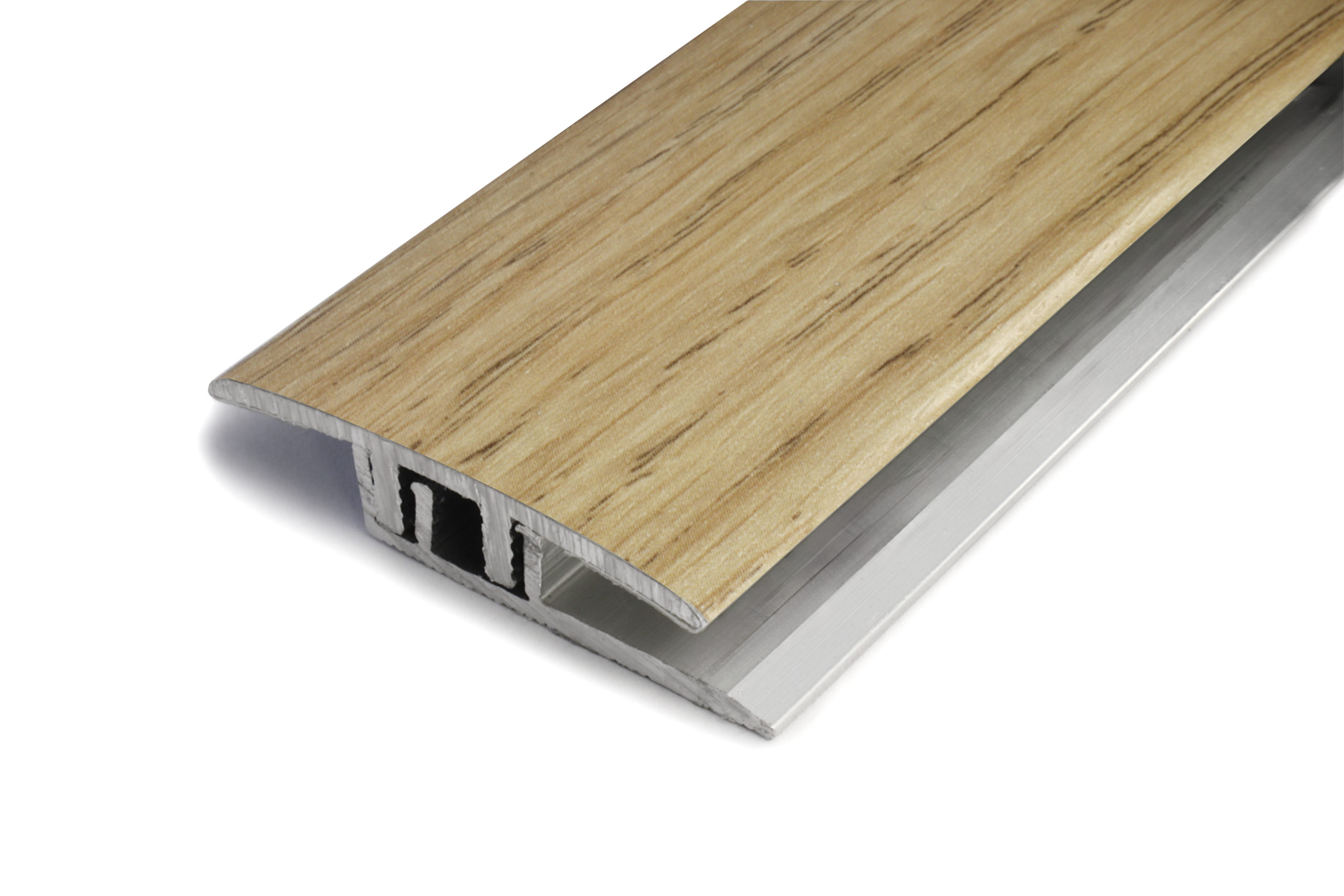 Metal cover strip with under rail. The multi-purpose Dione cover strip is suitable for joining floor materials in the same plane and for finishing expansion joints. Suitable for material thickness of 3.5-6.5 mm. The wood textured metal cover strip is Natural oak in colour. The durable metal strip is also suitable as a threshold. Thanks to the different material and colour options, the Dione cover strip completes the interior and connects the floor surfaces in a stylish way.