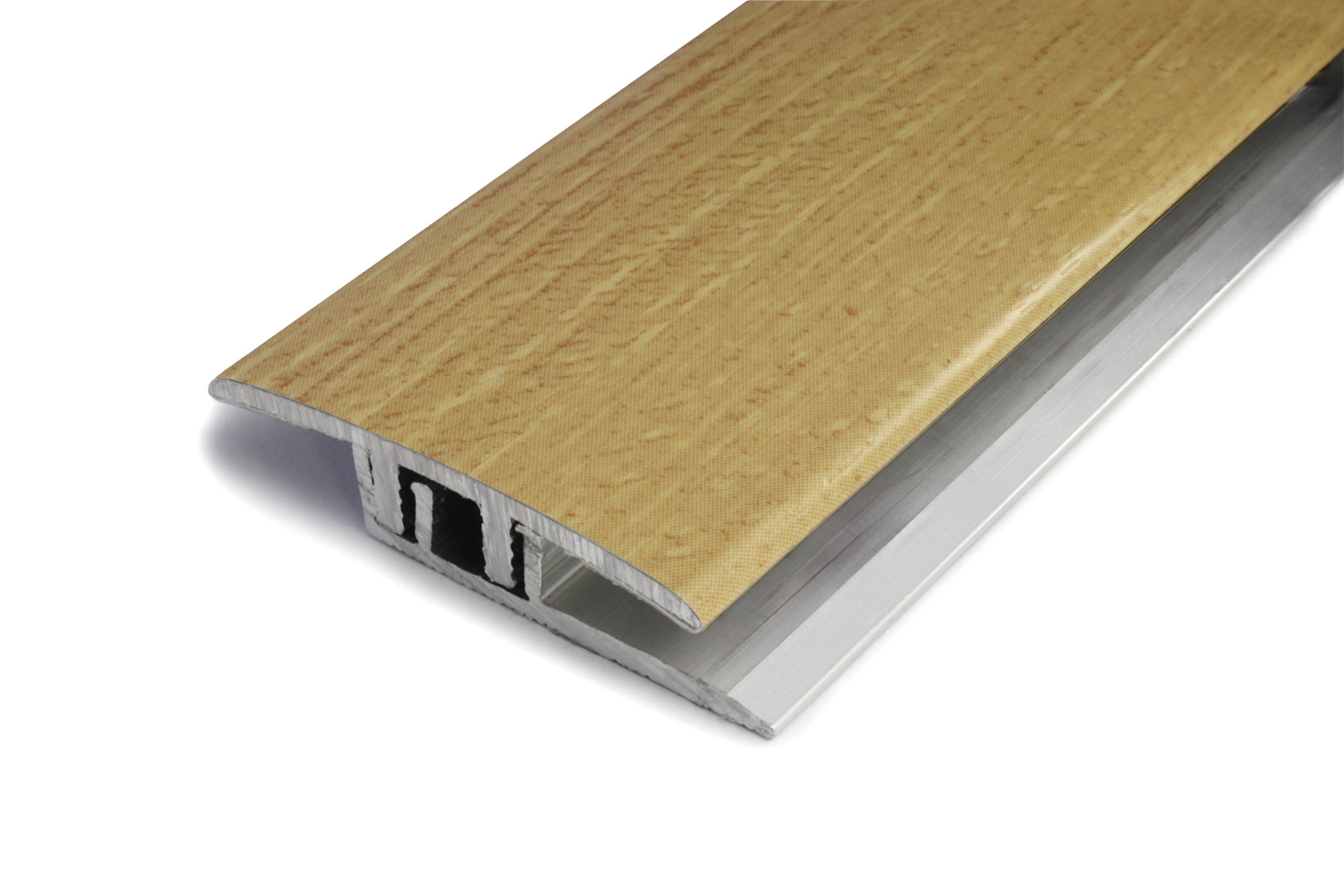 Metal cover strip with under rail. The multi-purpose Dione cover strip is suitable for joining floor materials in the same plane and for finishing expansion joints. Suitable for material thickness of 3.5-6.5 mm. The wood textured metal cover strip is Oak in colour. The durable metal strip is also suitable as a threshold. Thanks to the different material and colour options, the Dione cover strip completes the interior and connects the floor surfaces in a stylish way.
