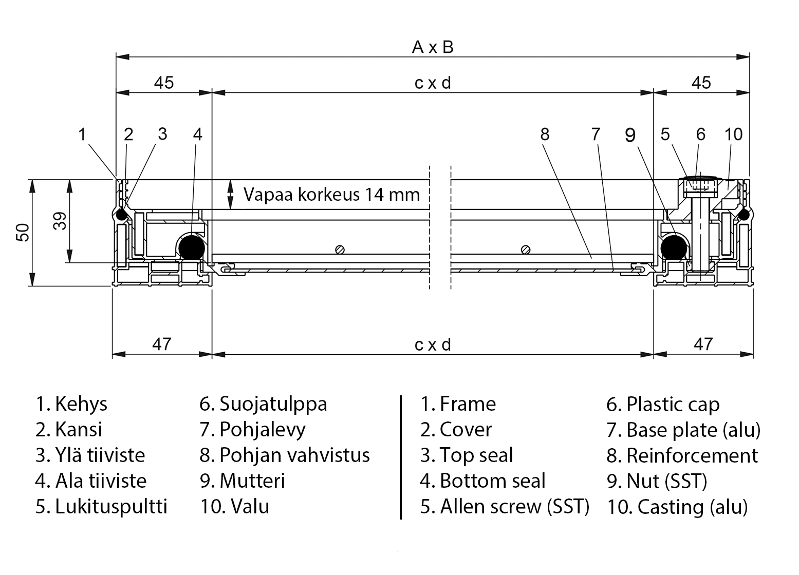 Access cover, aluminium. Frame is made of extruded aluminium, the cover is made of aluminium plate. The total height of the cover is 50mm. Filled with a thinner surface, the cover is light to open. Gas and water-proof access cover which is manufactured with accurate dimensions. Two chemical-resistant special seals in frame. The conical design and lifting key make it easier to open the cover. Thanks to the small angles and accurately dimensioned edge structure, the cover is almost unnoticeable after installation. The cover has reinforcing that improves its load endurance. For indoor projects which are demanding access covers with lighter weight ,thinner structure and high corrosion resistance or better hygiene, such as foodprocessing premises or hospitals. Load endurance 15kN.