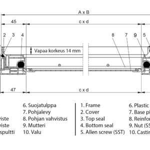 Access cover, aluminium. Frame is made of extruded aluminium, the cover is made of aluminium plate. The total height of the cover is 50mm. Filled with a thinner surface, the cover is light to open. Gas and water-proof access cover which is manufactured with accurate dimensions. Two chemical-resistant special seals in frame. The conical design and lifting key make it easier to open the cover. Thanks to the small angles and accurately dimensioned edge structure, the cover is almost unnoticeable after installation. The cover has reinforcing that improves its load endurance. For indoor projects which are demanding access covers with lighter weight ,thinner structure and high corrosion resistance or better hygiene, such as foodprocessing premises or hospitals. Load endurance 15kN.