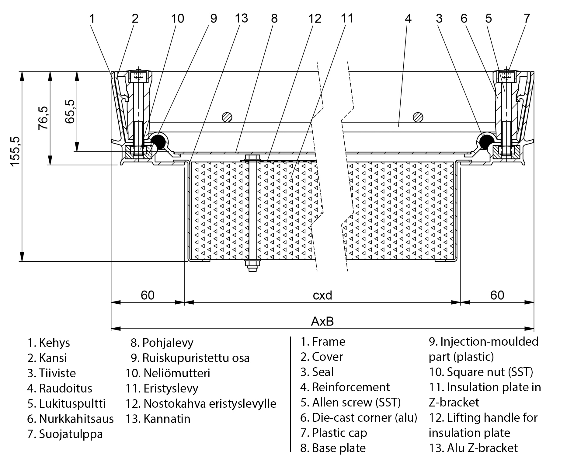 Access cover, aluminium. Frame is extruded aluminium and the cover is made of aluminium plate. The cover has a detachable aluminium-coated thermal insulation plate. Cover is gas- and Waterproof. The special seal withstands chemicals well. Conical design and lifting key creates a it easier to open the cover. Thanks to the small angles and accurately dimensioned edge structure, the cover is almost unnoticeable in the ground after installation. The door is fitted with internal reinforcing that improves its load endurance. Suitable for projects, which demands gas- and waterproof access doors and the cover is required to have special thermal insulation capacity in indoor and outdoor use. Load endurace 125kN.