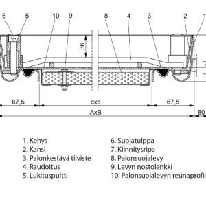 Access cover ,galvanized steel.Whole structure is galvanized after welding.Gas- and waterproof access cover which is manufactured with accurate dimensions.Tested for 120 minutes of fire resistance.The special seal withstands chemicals well.The conical design and lifting key make it easier to open the cover. Thanks to the small angles and accurately dimensioned edge structure, the cover is almost unnoticeable after installation.The cover has reinforcing that improves its load endurance.Suitable for premises with high fire safety requirements.Fire protection confirmed by the official IBS fire endurance test. Applications: access doors that require gas- and waterproofness and high fire endurance in indoor and outdoor use.Load endurance 125kN.Fire-resistance rating EI120