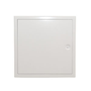 Access cover with an aluminum frame and a plasterboard insert. Insert with two plasterboards, visible screwheads. Air and dustproof. Soundproof. For wall and ceiling installations. Push lock. Suitable for wet rooms.