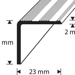 Dione stair nosing with glue fastening. Grooved surface. Width 23 mm. Height 23 mm. Polished aluminium. Length 2,700 mm.