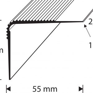 Dione stair nosing with glue fastening. Grooved surface. Width 55 mm. Height 43 mm. Polished aluminium. Length 2,700 mm.