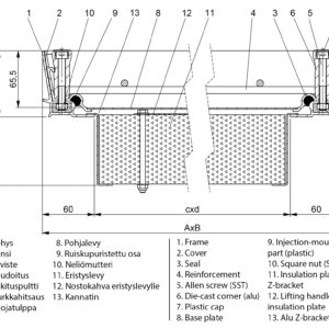Alumiiniluukku, kaasu- ja vesitiivis. Lämpöeriste. Sisä- ja ulkokäyttöön. Kuormituksen kesto 125kN.