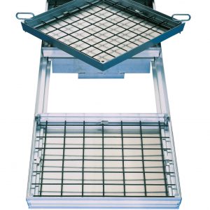 Alumiiniluukku, 2- tai 3-osainen. Varustettu tiivisteellä, mutta ei täysin vesi- ja kaasutiivis. Sisä- ja ulkokäyttöön. Kuormituksen kesto 125kN.