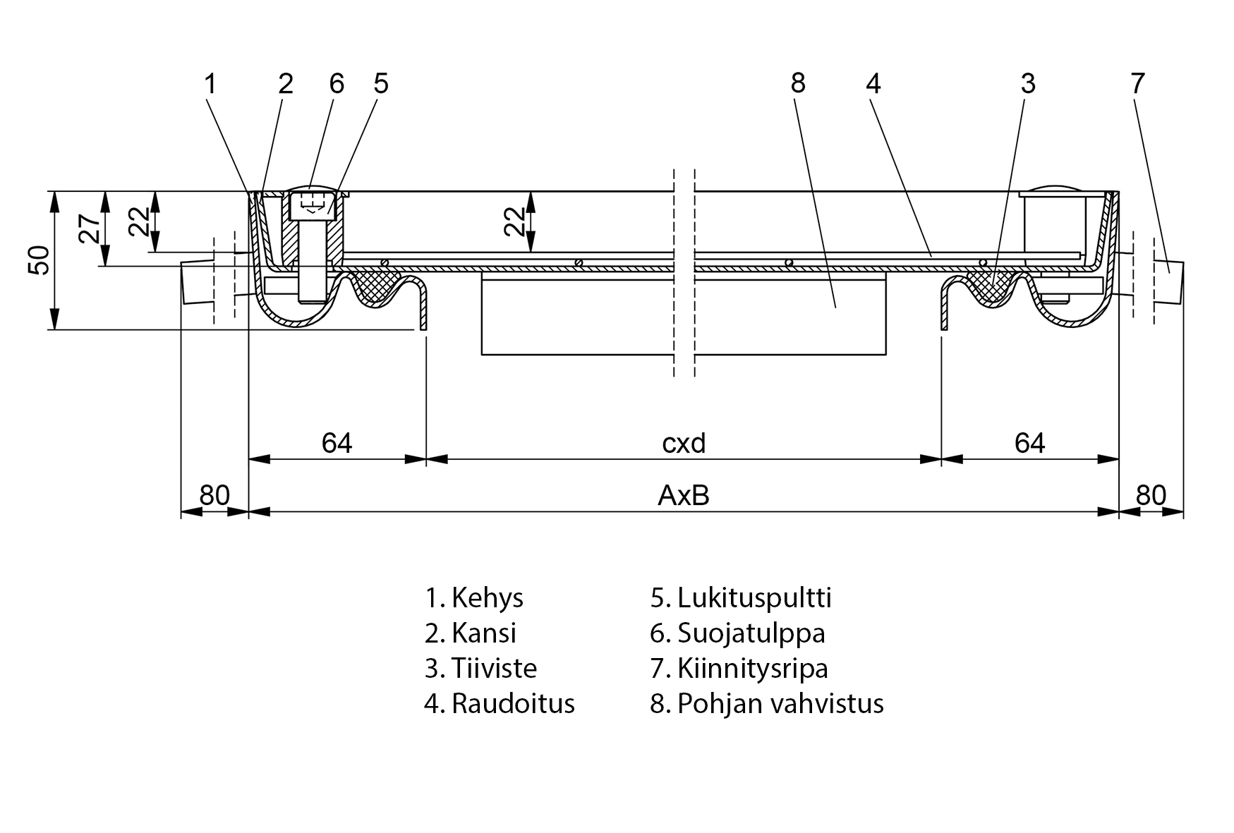 Teräsluukku, ruostumaton, teräslaatu-AISI304. Matala rakenne 50mm. Sisäkäyttöön. Kuormituksen kesto 15 kN.
