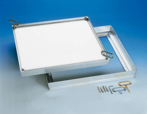 Revīzijas lūka, alumīnija. Vāks ir sākotnēji piepildīts ar vieglu alumīnija kompozītmateriālu. Gāzu un ūdensdroša. Lietošanai telpās. Celtspēja: 15 kN.