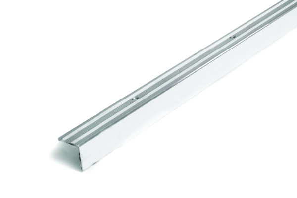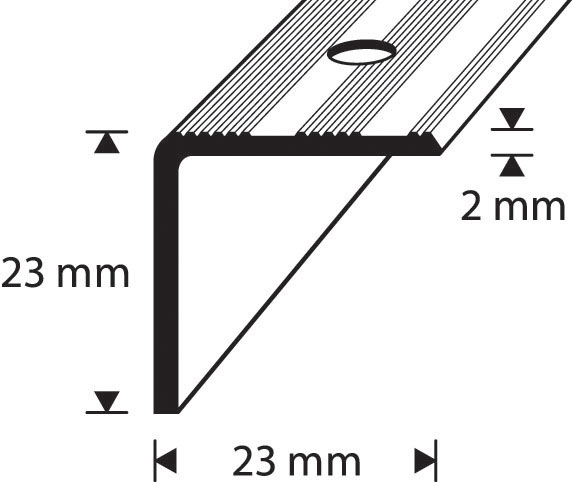Kāpņu stūra profils Dione ar skrūvju stiprinājumu. Ar rievotu virsmu. Pulēta alumīnija. Platums: 23 mm. Augstums: 23 mm. Garums: 3000 mm.