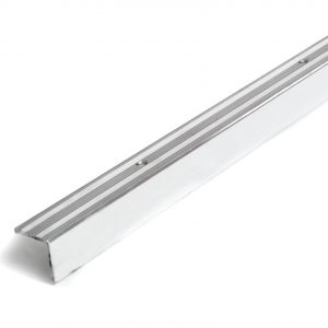 Kāpņu stūra profils Dione ar skrūvju stiprinājumu. Ar rievotu virsmu. Pulēta alumīnija. Platums: 23 mm. Augstums: 23 mm. Garums: 900 mm.