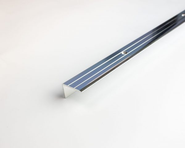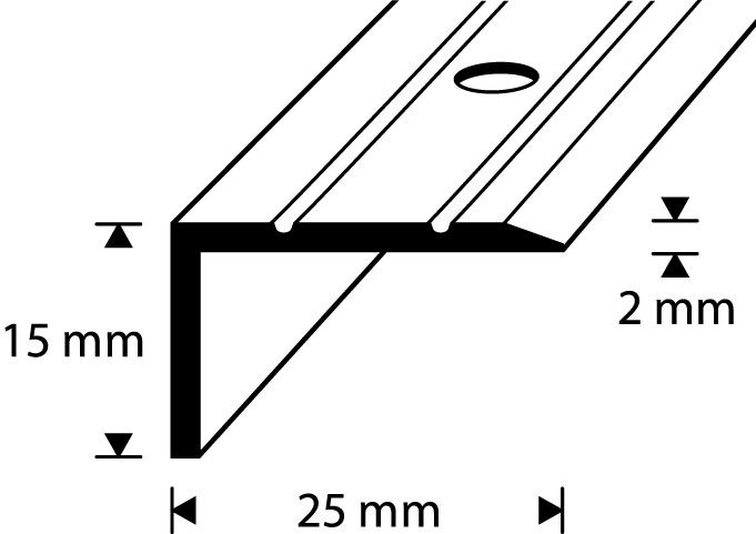 Kāpņu stūra profils Dione ar skrūvju stiprinājumu. Ar rievotu virsmu. Pulēta alumīnija. Platums: 25 mm. Augstums: 15 mm. Garums: 2700 mm.