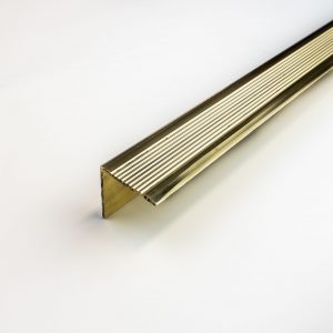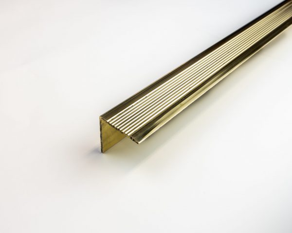 Kāpņu stūra profils Dione ar līmes stiprinājumu. Ar rievotu virsmu. Gaiša misiņa. Platums: 30 mm. Augstums: 30 mm. Garums: 3000 mm.