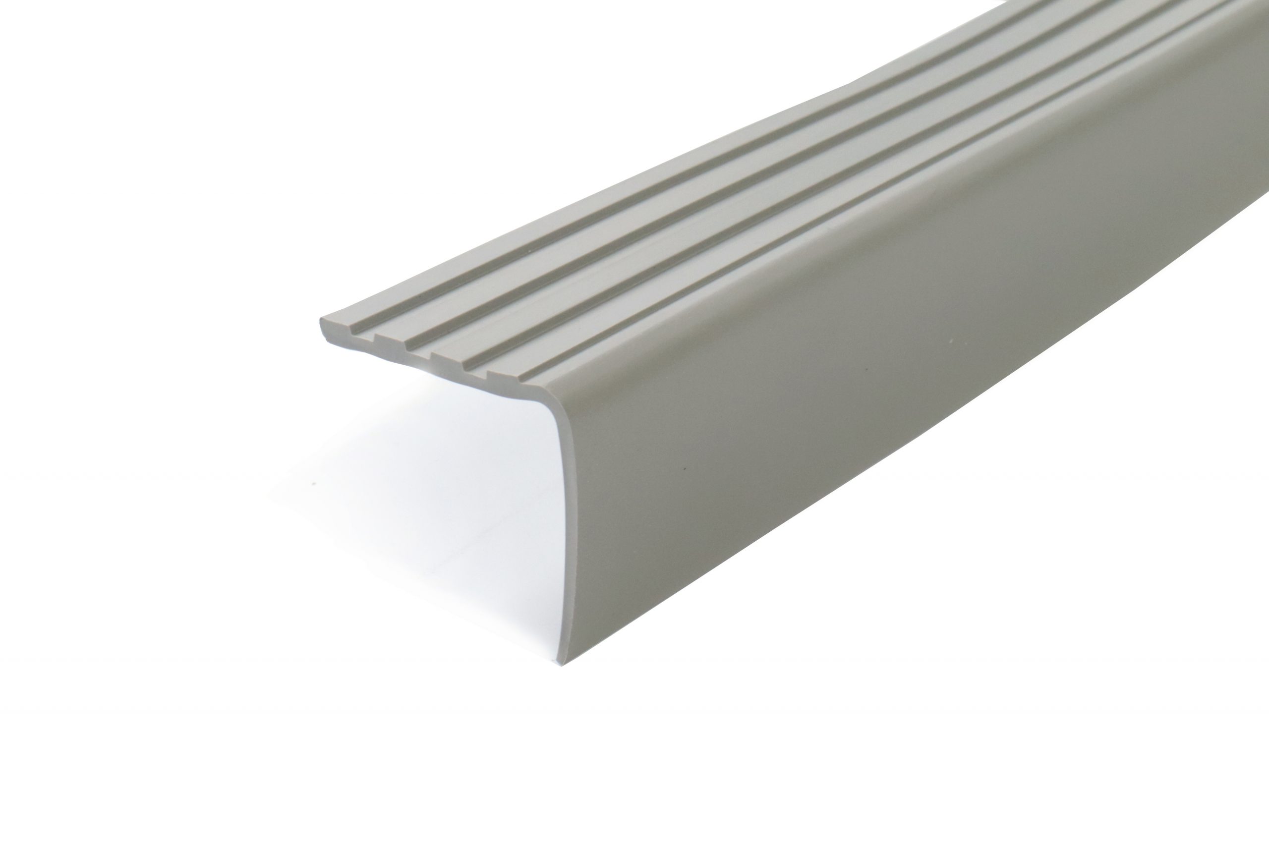 Kāpņu stūra profils Dione ar līmes stiprinājumu. Ar rievotu virsmu. Plastmasas. Vidēji pelēks. Platums: 38 mm. Augstums: 37 mm. Garums: 2500 mm.