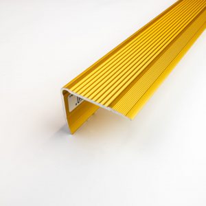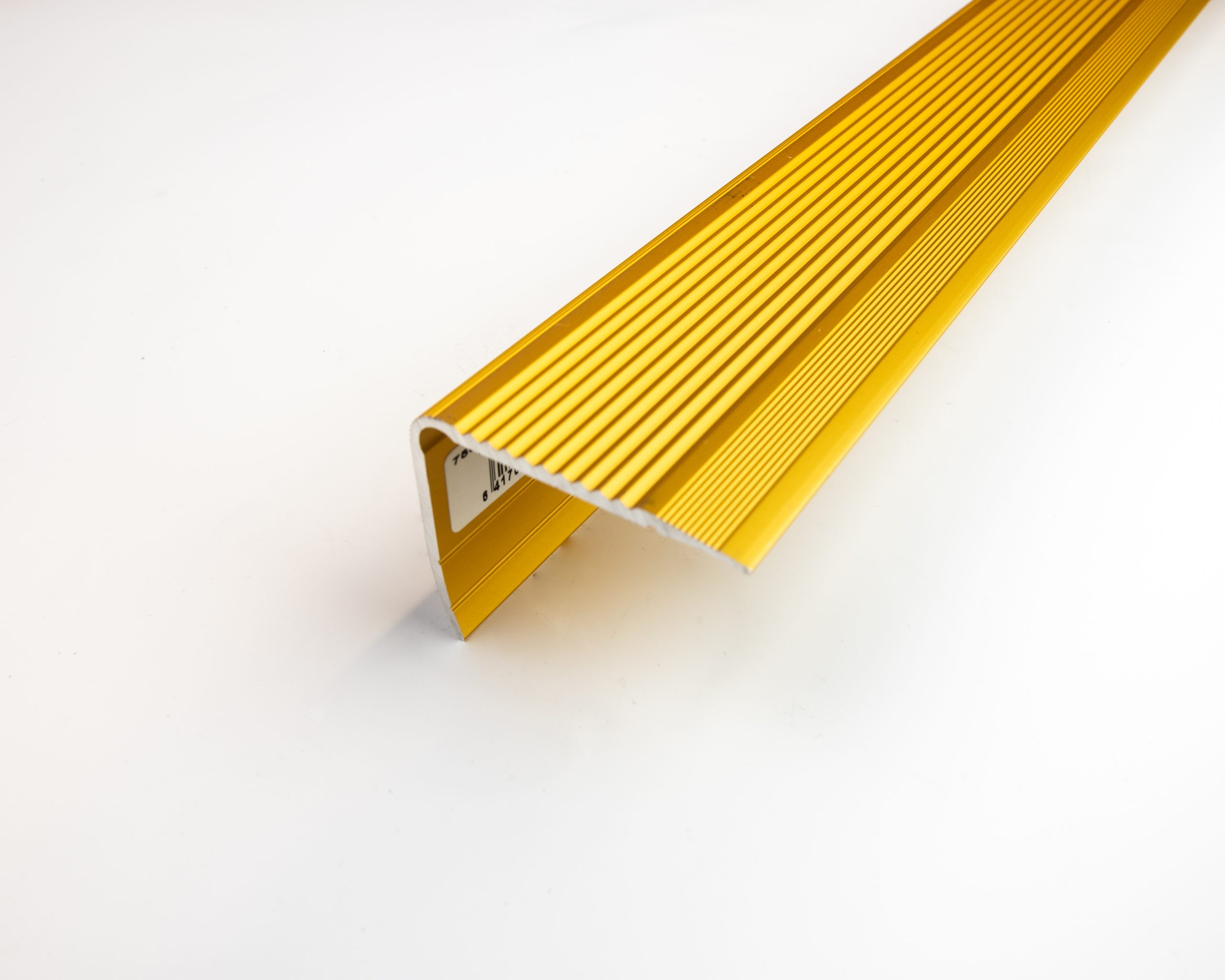 Kāpņu stūra profils Dione ar līmes stiprinājumu. Ar rievotu virsmu. Zelta krāsā anodēta alumīnija. Platums: 56 mm. Augstums: 47 mm. Garums: 3200 mm.