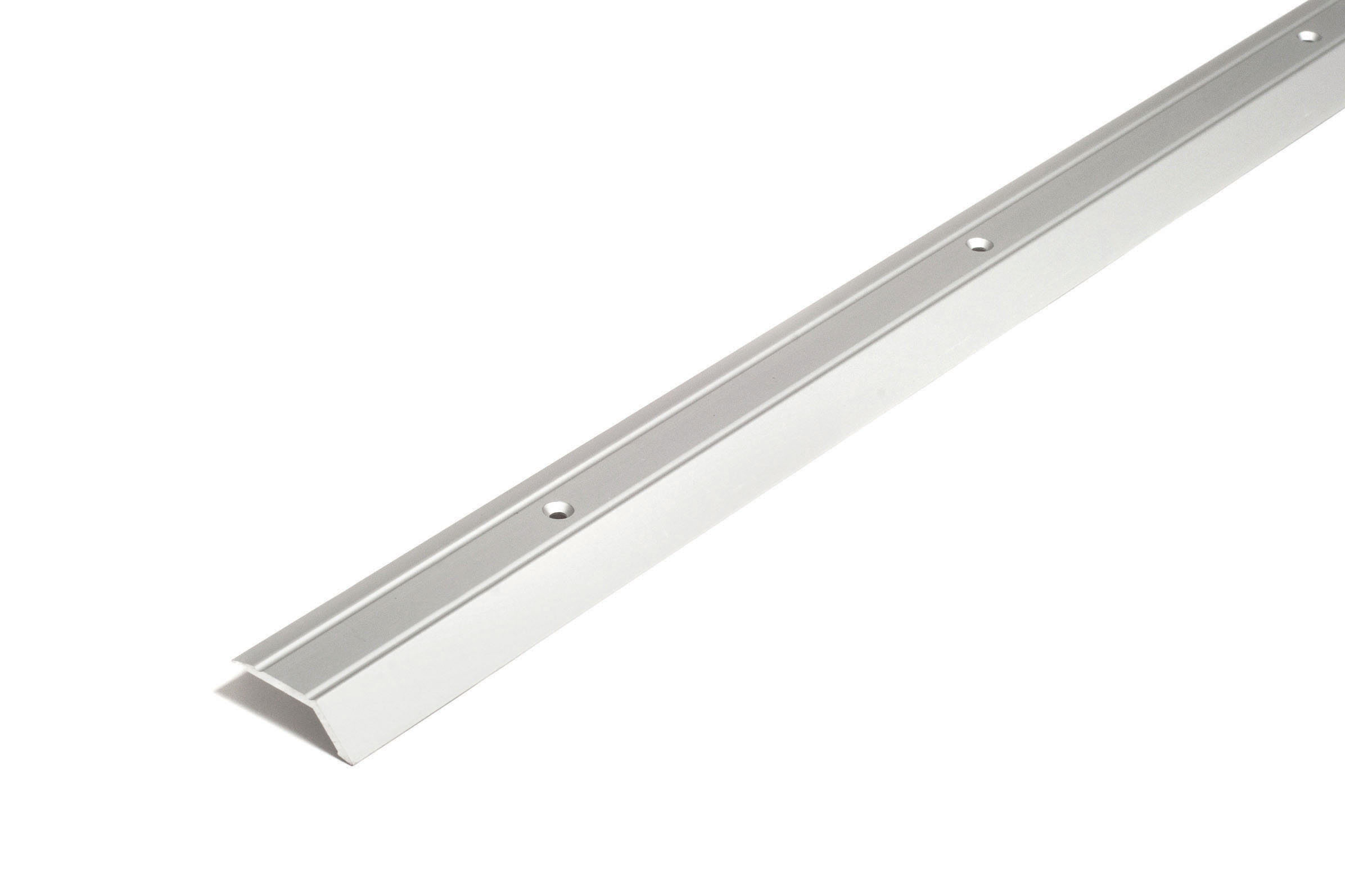 Pārejas līste Dione ar skrūvju stiprinājumu. Ar rievotu virsmu. Sudraba krāsā anodēta alumīnija. Platums: 32 mm. Augstums: 8,0 mm. Garums: 2000 mm.