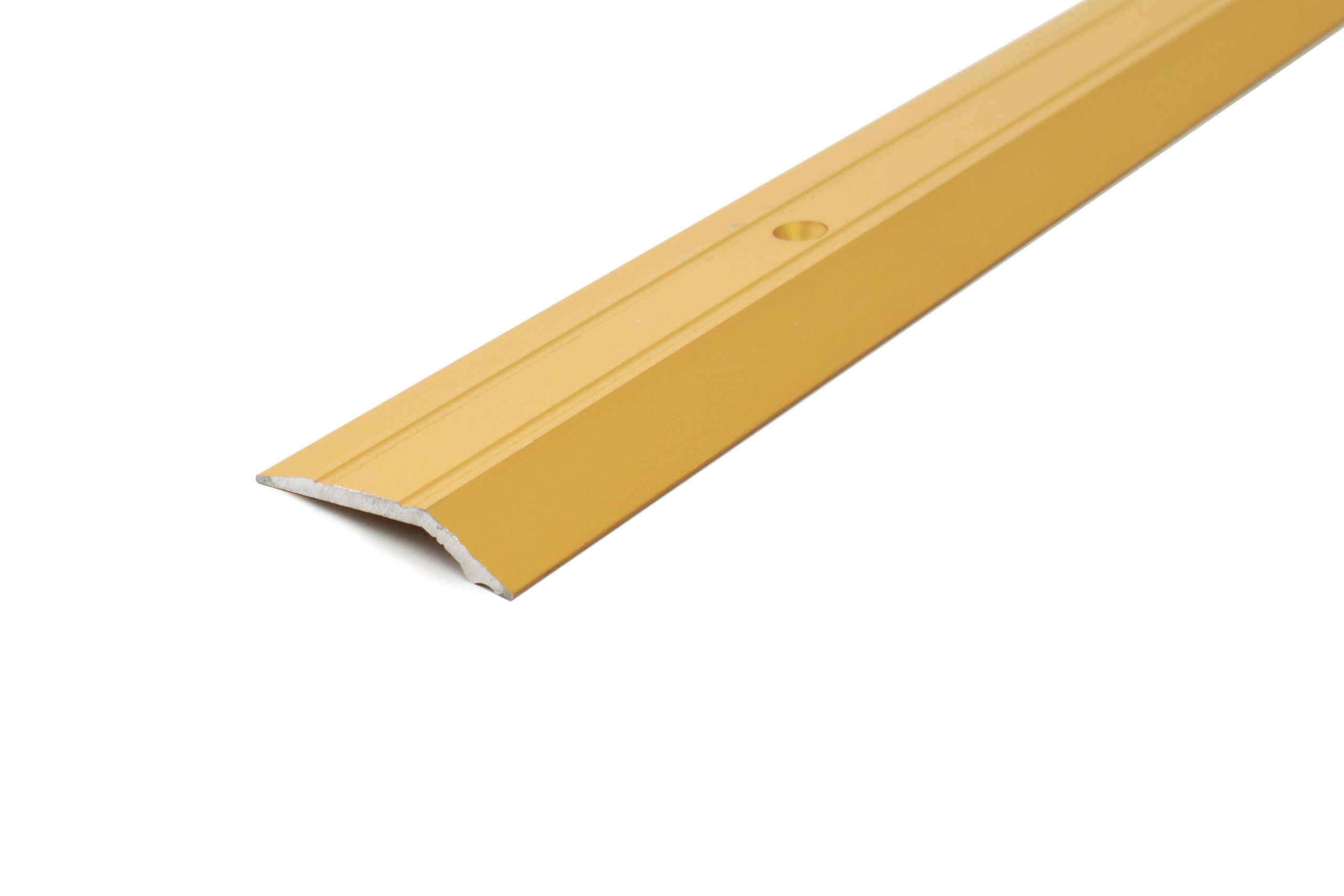 Pārejas līste Dione ar skrūvju stiprinājumu. Ar rievotu virsmu. Zelta krāsā anodēta alumīnija. Platums: 32 mm. Augstums: 4,5 mm. Garums: 2700 mm.
