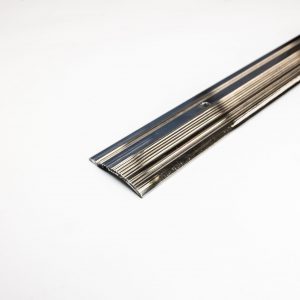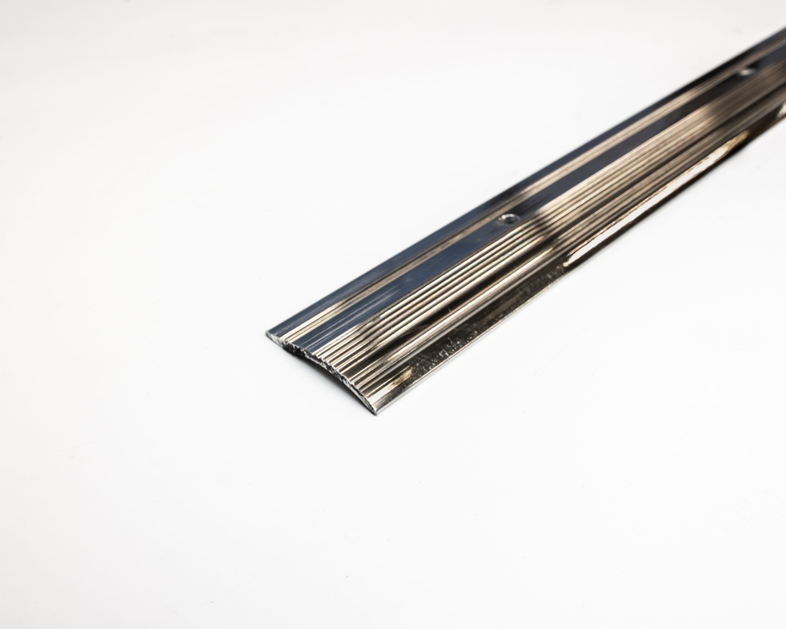 Pārejas līste Dione ar skrūvju stiprinājumu. Ar nelīdzenu virsmu. Pulēta alumīnija. Platums: 40 mm. Augstums: 0–12 mm. Garums: 2700 mm.