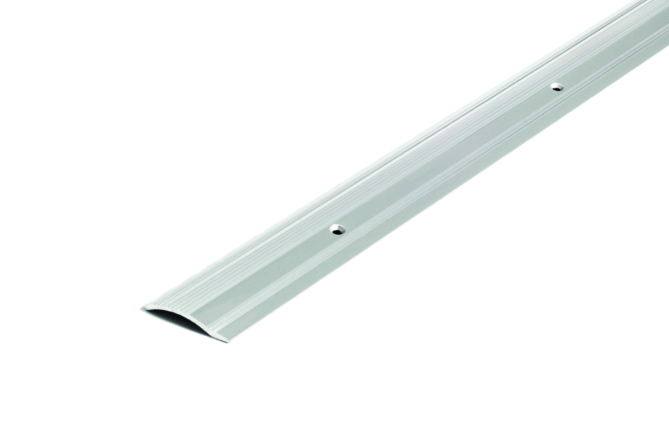 Pārejas līste Dione ar skrūvju stiprinājumu. Ar rievotu virsmu. Hroma krāsā anodēta alumīnija. Platums: 40 mm. Augstums: 0–12 mm. Garums: 1000 mm.