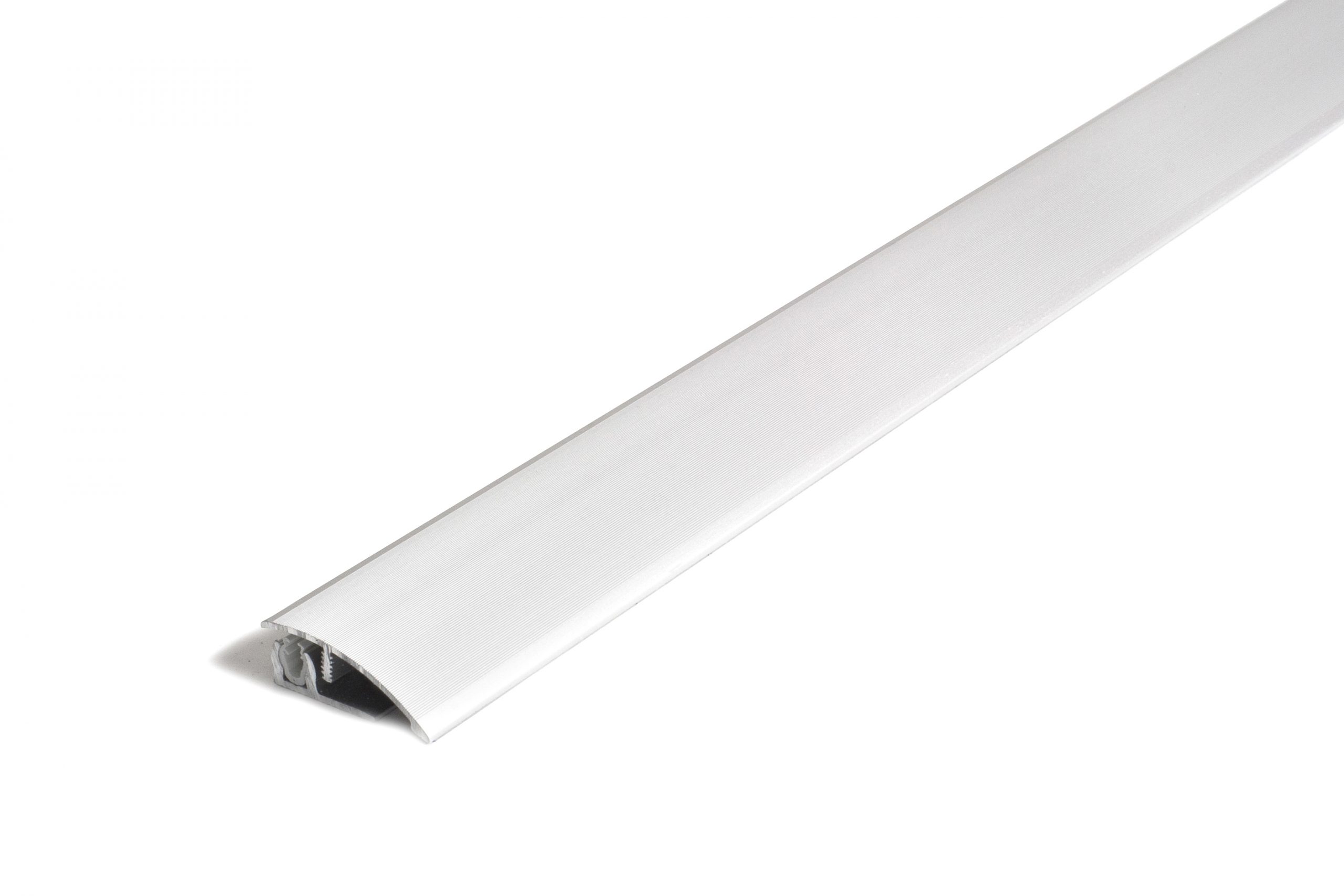 Pārejas līste Dione ar apakšējo sliedi. Ar nelīdzenu virsmu. Sudraba krāsā anodēta alumīnija. Platums: 45 mm. Augstums: 7–18 mm. Garums: 1800 mm.