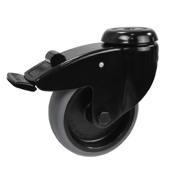 Dione Mekano ® Ø 50 Kääntyvä pyörä jarrulla. Pyörää voi käyttää 26,9mm ja 42,4mm putkien, kiinnikkeiden ja liittimien kanssa. Dynaaminen kuormituksen kesto 40kg. Staattinen kuormituksen kesto 80kg.