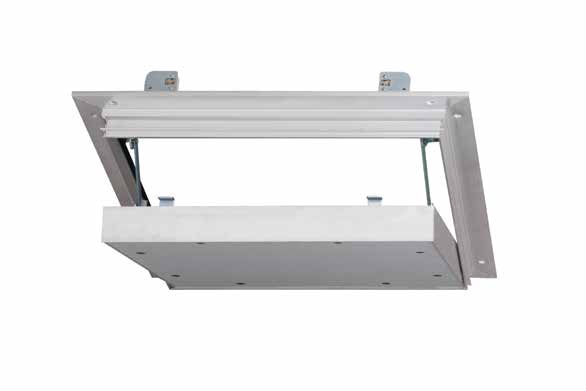 Brandlucka i aluminium med inlägg av gipsskiva. Synliga skruvhuvuden på locket. Brandklass EI 30. För vägginstallationer. Trycklåsning.