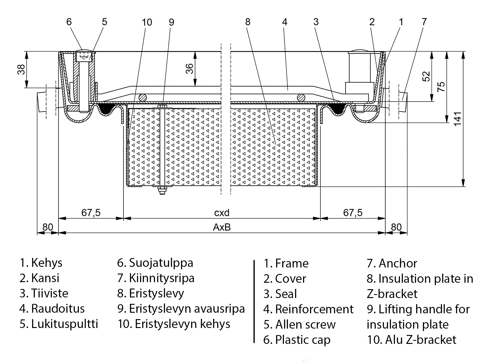 Lucka tillverkad av galvaniserat stål. Konstruktionen är galvaniserad efter svetsningen. Luckan har en aluminiumbelagd värmeisoleringsskiva som kan avlägsnas. Luckan är gas- och vattentät. Den speciella tätningen tål kemikalier väl. Konisk design och lyftnyckel gör det lättare att öppna luckan. Tack vare de små hörnen och den måttnoggranna kantkonstruktionen är luckan nästan omärkbar i underlaget efter installationen. Luckan är försedd med inre förstärkningar som förbättrar dess belastningshållbarhet. Lämplig för projekt som kräver gas- och vattentäthet, inomhus och utomhus, där speciell värmeisolering krävs. Belastningshållbarhet 125 kN. Brandklass EI30