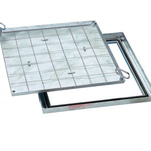 Lucka, förzinkat stål. Låg konstruktion 50 mm. Gas- och vattentät. För inomhusbruk. Belastningshållbarhet 15 kN.