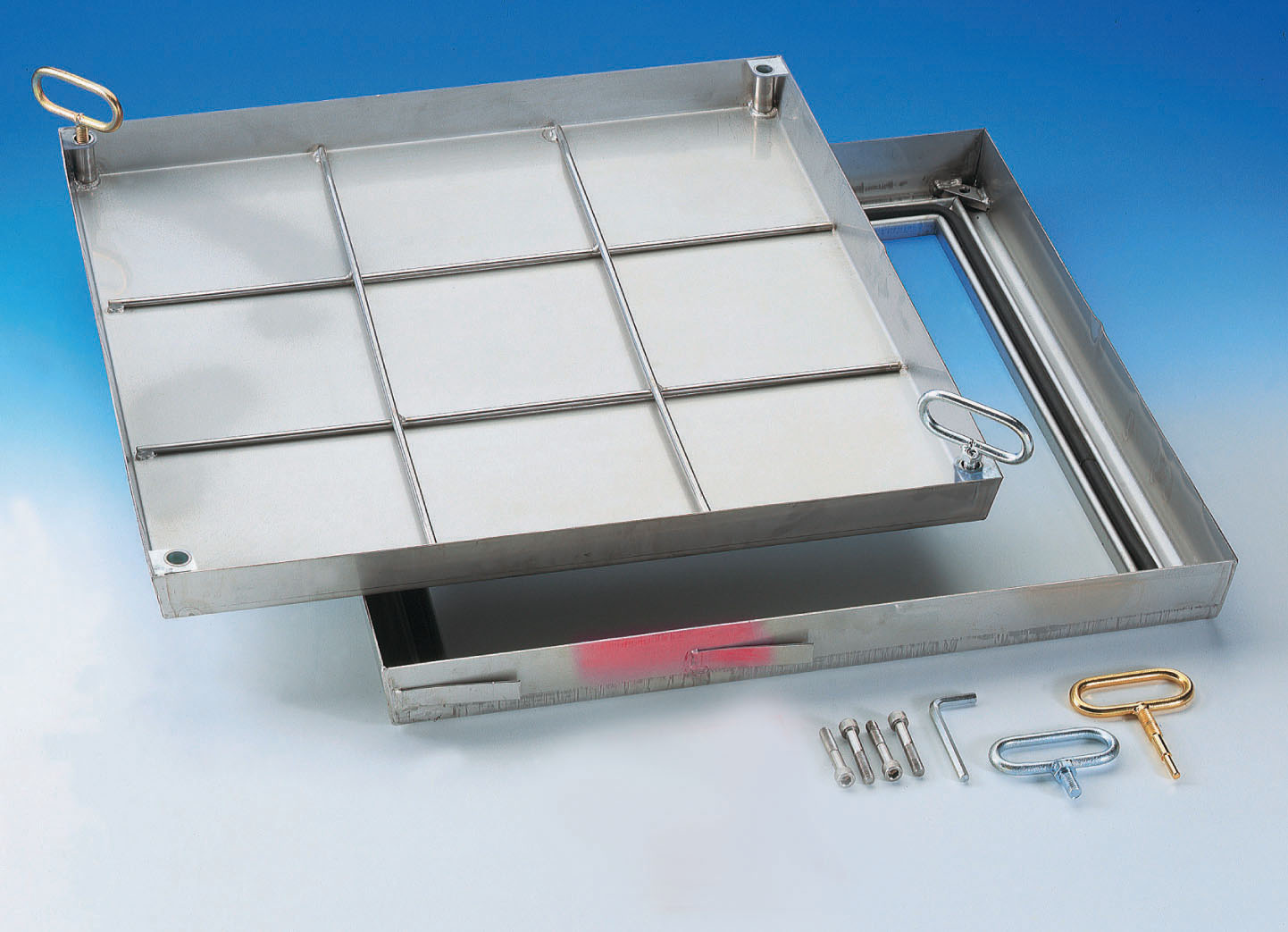 Lucka, rostfritt stål AISI304. Gas- och vattentät. För inom- och utomhusbruk. Belastningshållbarhet 125 kN. EI30