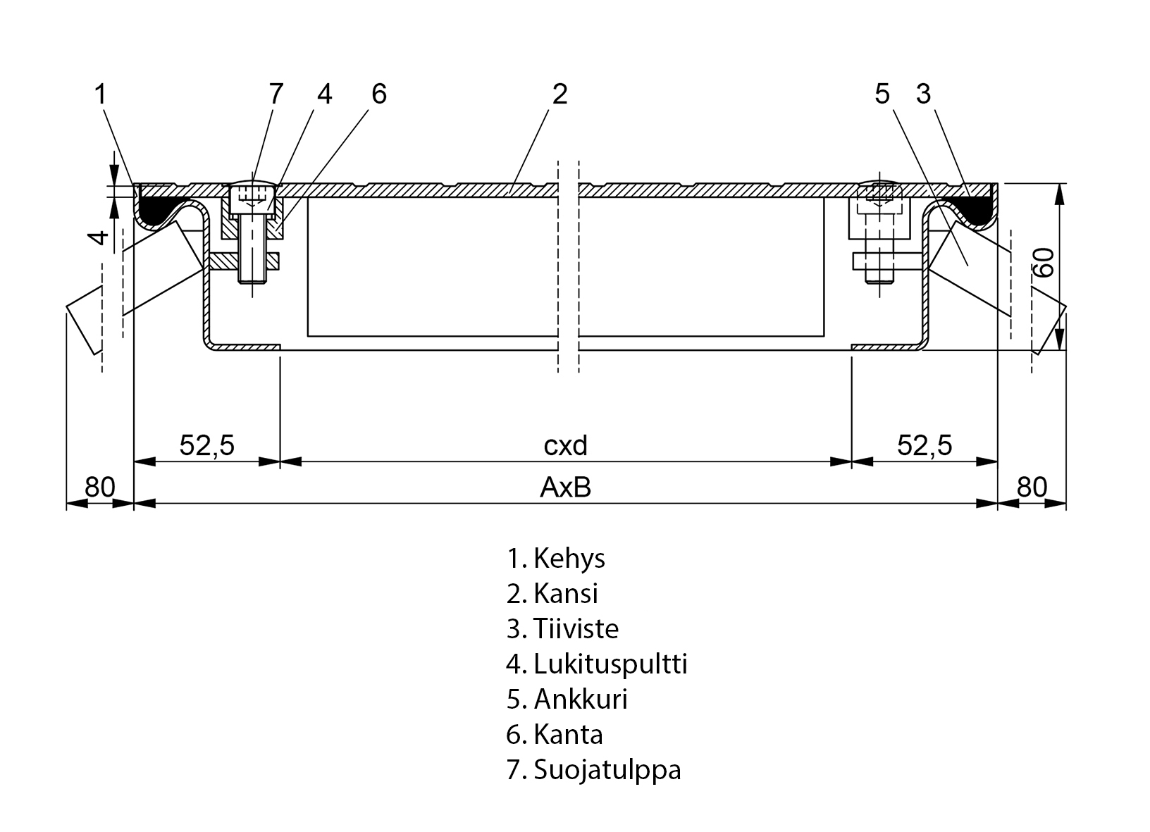 Lucka, rostfritt stål AISI304. Täckplattan har rutmönster för minskad halkrisk. Gas- och vattentät. För inom- och utomhusbruk. Belastningshållbarhet 15 kN. EI30