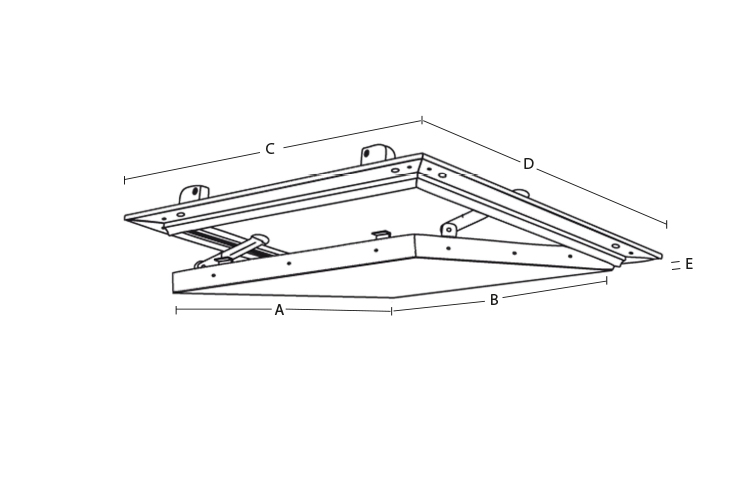 Lucka med aluminiumram och inlägg av gipsskiva. Inga synliga skruvhuvuden på locket. Luft- och dammtät. Ljudisolerad. För vägg- och takinstallationer. Trycklåsning. Lämplig för våtrum.