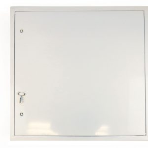 Lucka med aluminiumram och inlägg av gipsskiva. Inlägg med två gipsskivor, inga synliga skruvhuvuden. Luft- och dammtät. Ljudisolerad. För vägg- och takinstallationer. Trycklåsning. Lämplig för våtrum.