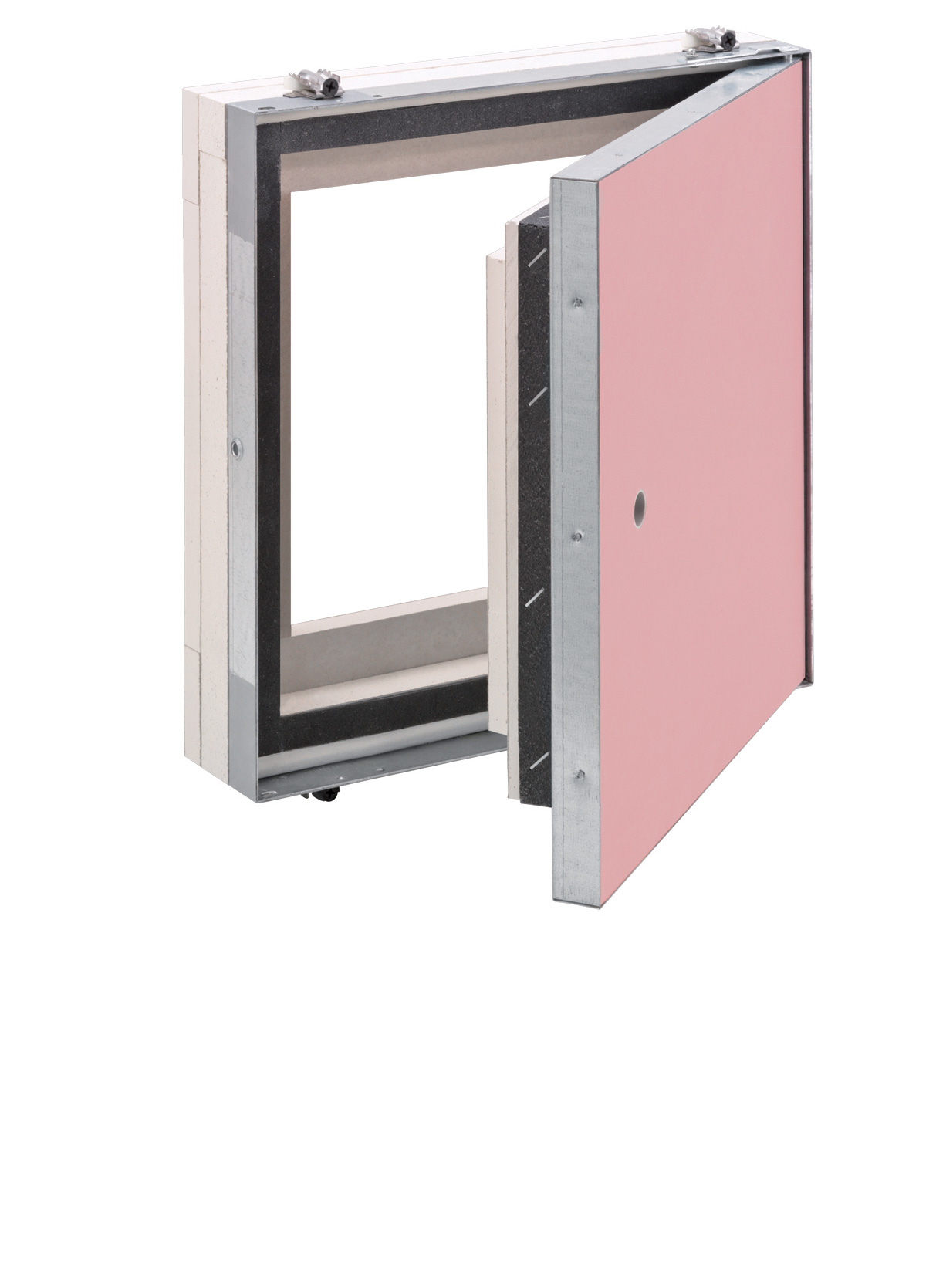Brandsäker lucka tillverkad av förzinkat stål med en brandsäker gipsskiva. För vägginstallationer. Brandklass F 30/EI 30.