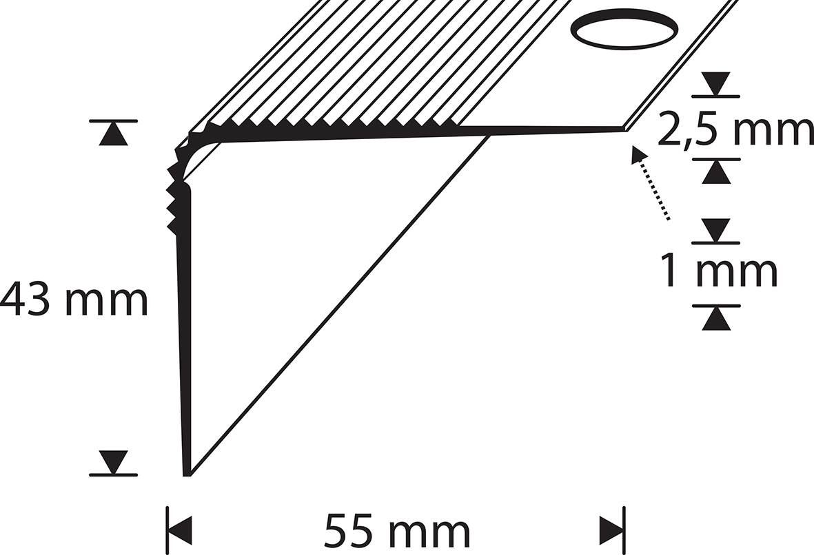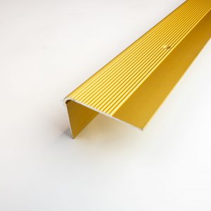 Dione trappkantlist med skruvmontering. Räfflad yta. Bredd 50 mm. Höjd 43 mm. Guldanodiserad aluminium. Längd 2 700 mm.